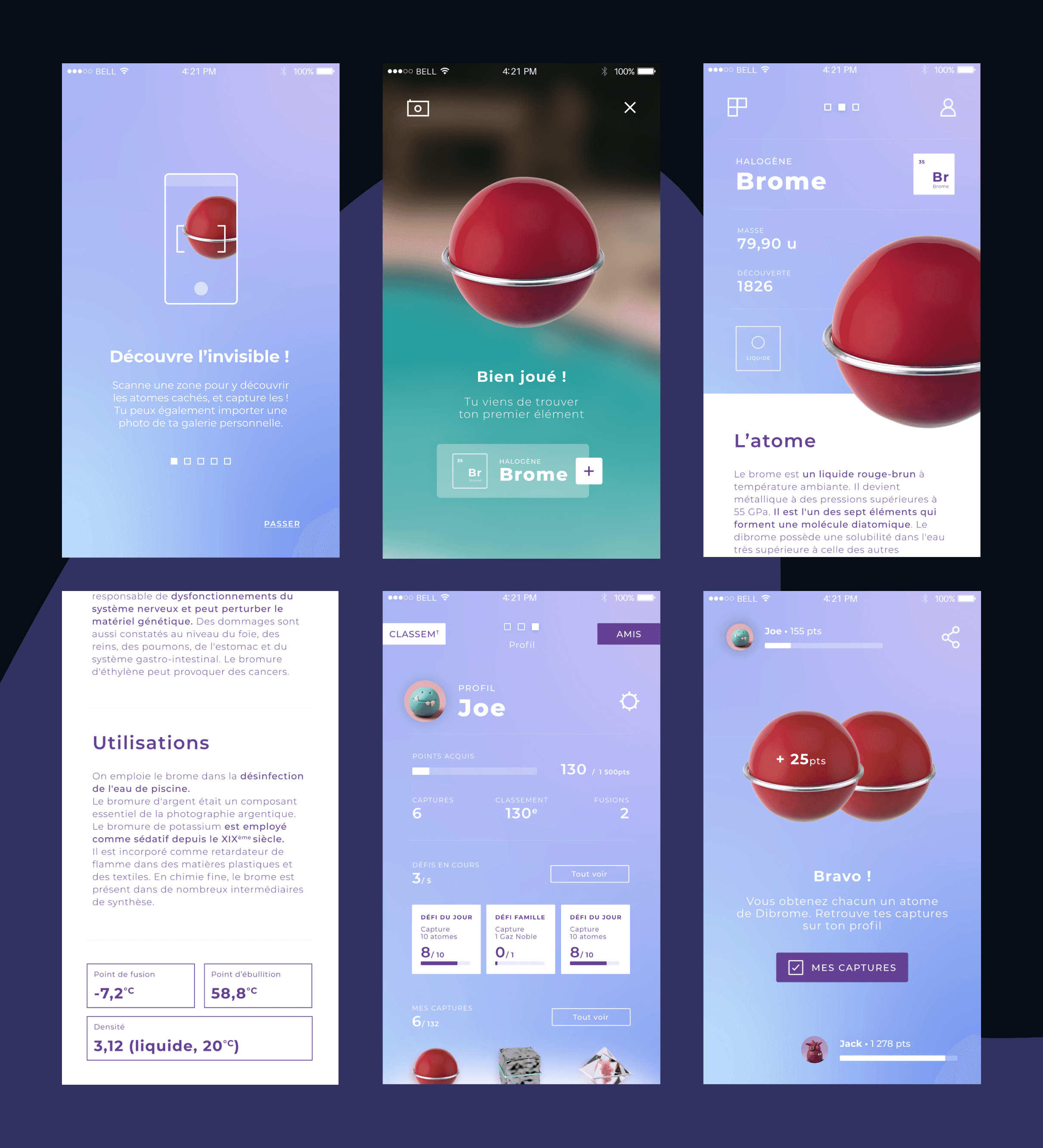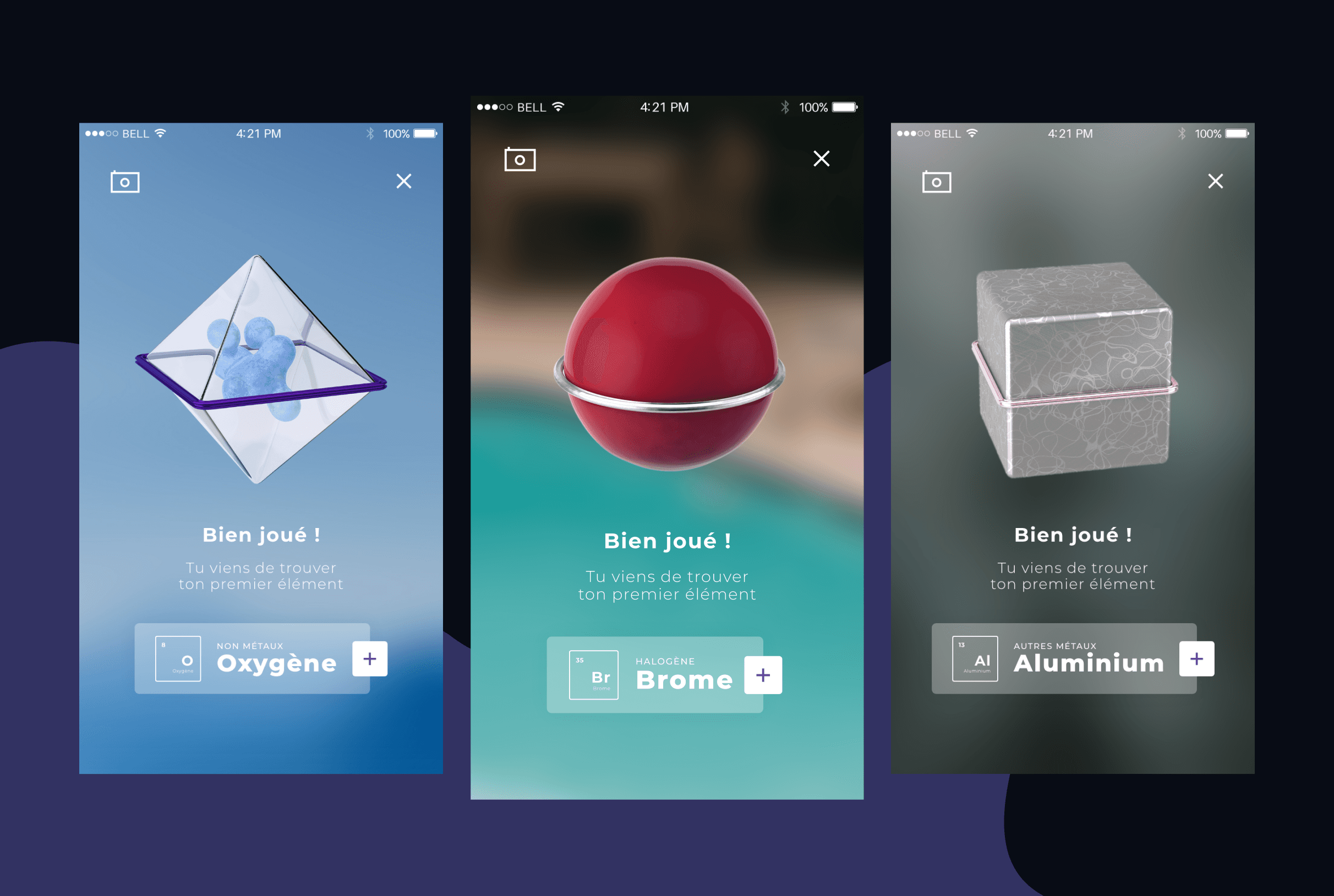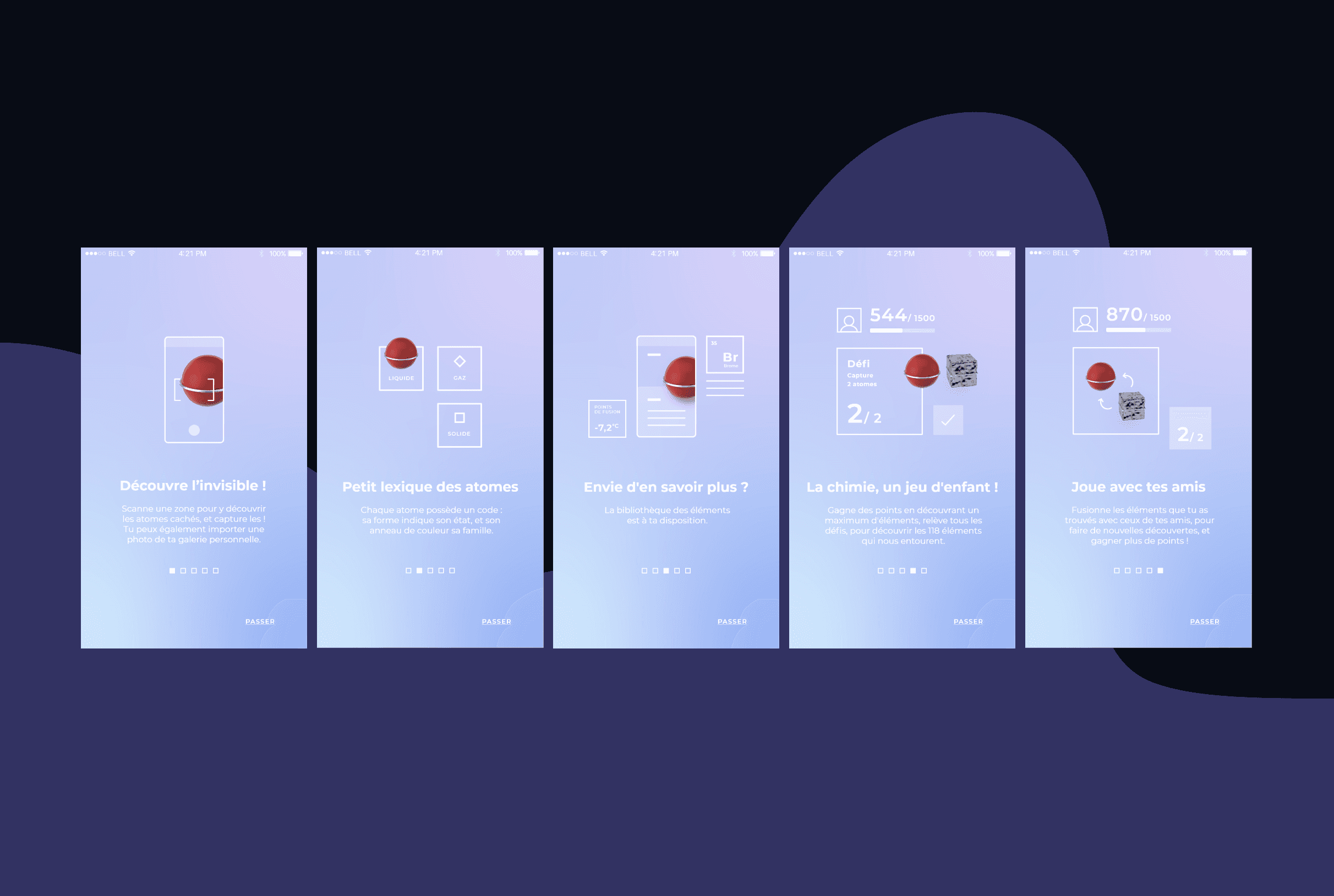 Conçu lors de mon M2 en Direction Artistique Numérique (2019), Kimia est une application mobile explorant la chimie à travers une approche graphique et pédagogique. Inspirée par l’Année internationale du tableau périodique proclamée par l’UNESCO, Kimia réinterprète graphiquement les atomes et met en lumière l’importance des sciences fondamentales dans les enjeux du développement durable à l’horizon 2030.